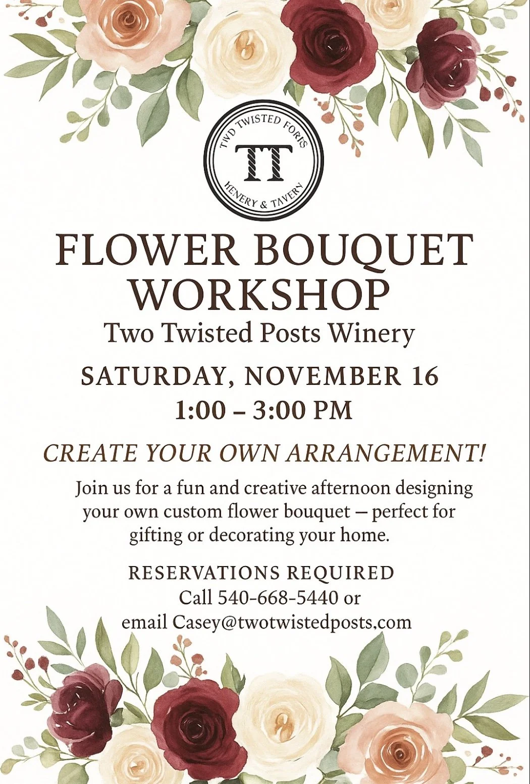 Call or email to reserve your spot Casey@twotwistedposts.com